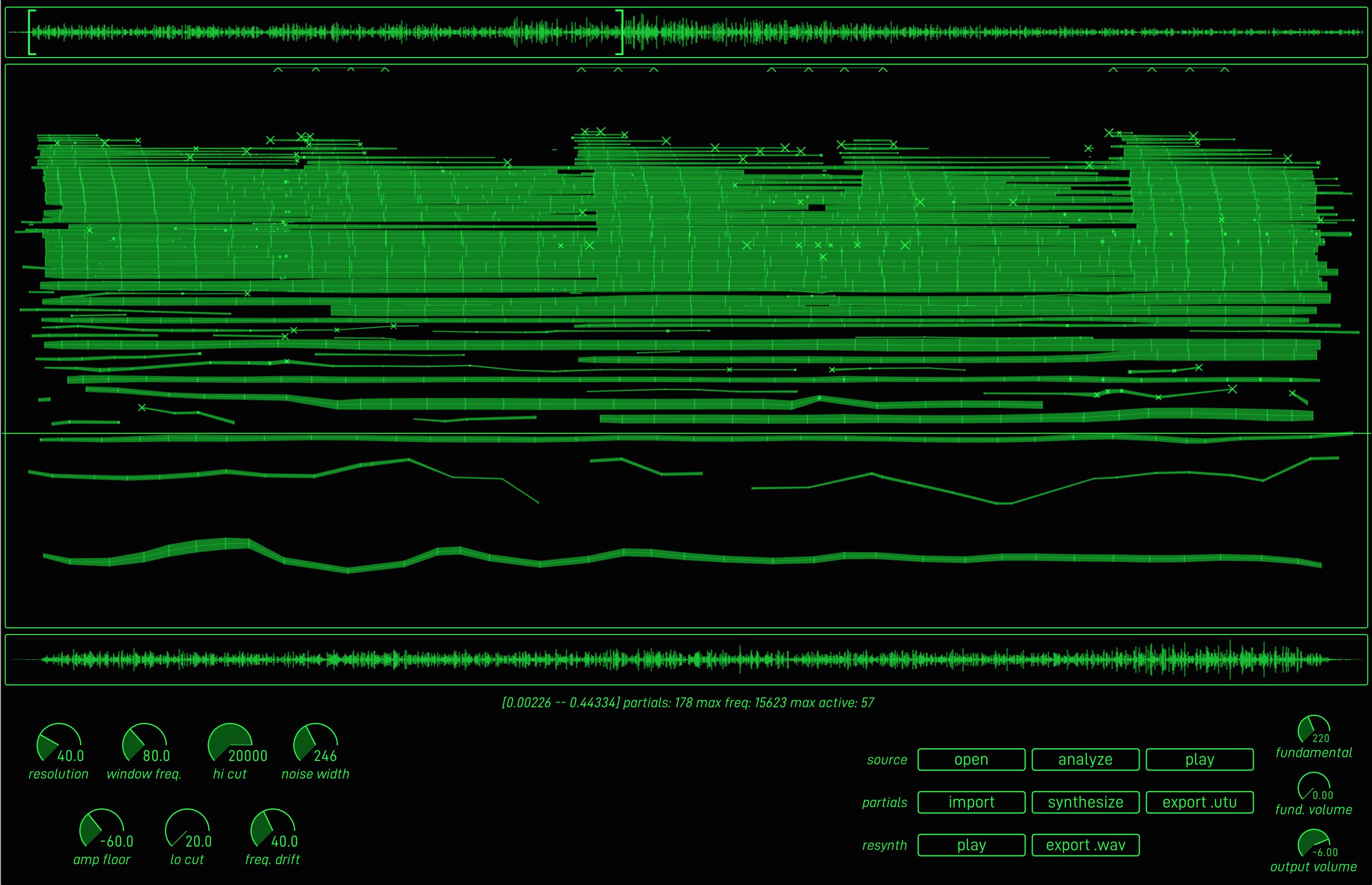 In Sumu, sampled sounds are represented as collections of up to 64 bandwidth-enhanced partials, each with a frequency, volume, and noisiness that can change over time. This representation of sound makes all kinds of creative changes possible, from natural-sounding time stretching to exotic timbral manipulations. Using the central multi-channel patcher, each partial in a sound can be manipulated independently in a way that feels more like playing than programming. Pick a few harmonics and frequency-modulate them? No problem. Delay each partial according to its frequency? Sure.